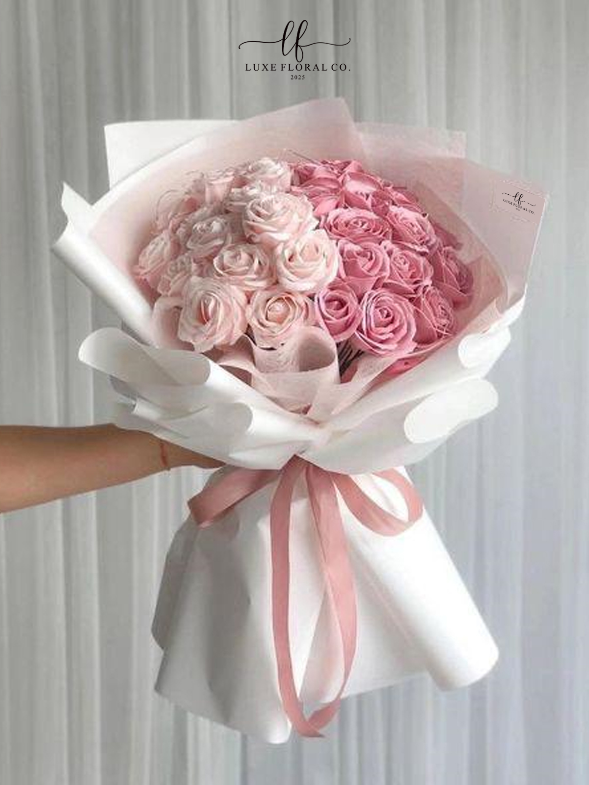 Introducing Luxe Blush Cascade, a captivating ombré rose bouquet that effortlessly blends charm, elegance, and femininity. Featuring a seamless gradient of soft blush to petal pink roses, this design is pure visual poetry—wrapped in structured white paper and finished with a graceful satin bow.