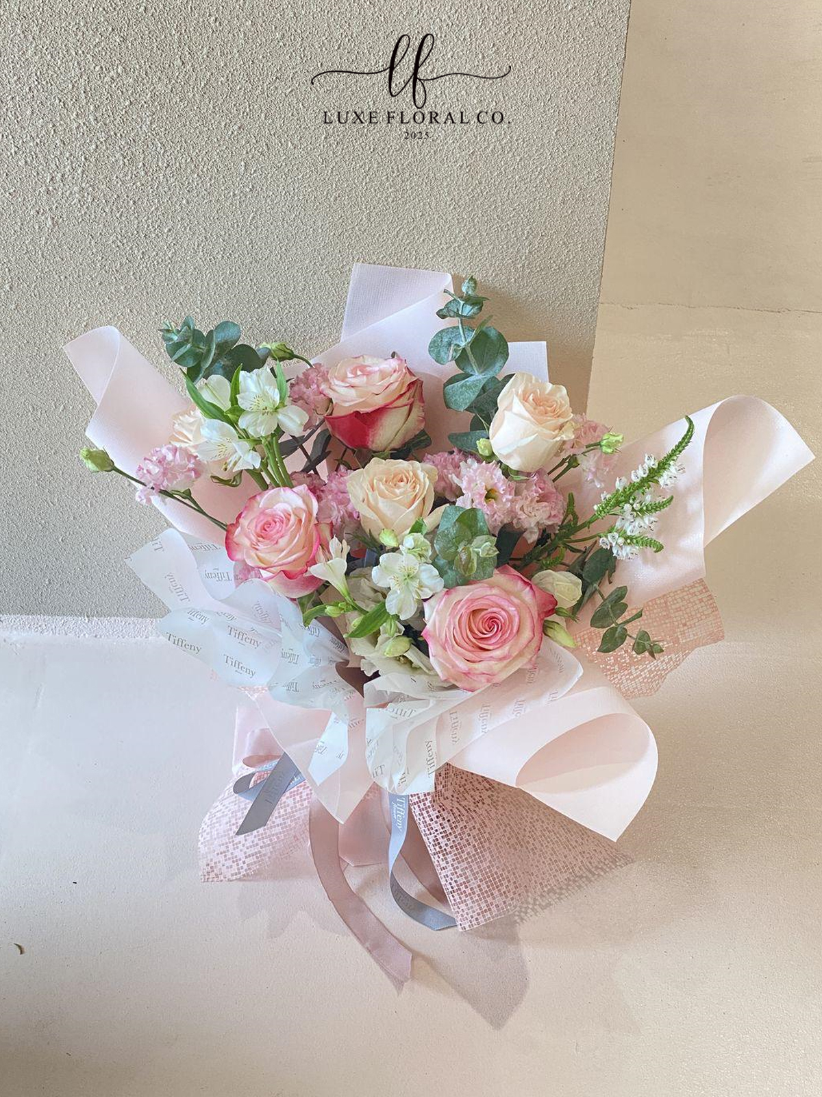 This enchanting arrangement features blush pink and cream roses, delicate white alstroemeria, and soft pastel fillers, all complemented by eucalyptus greens for a fresh, modern touch. Wrapped in layered pink mesh and satin ribbon, it’s designed to look effortlessly chic and endlessly thoughtful.